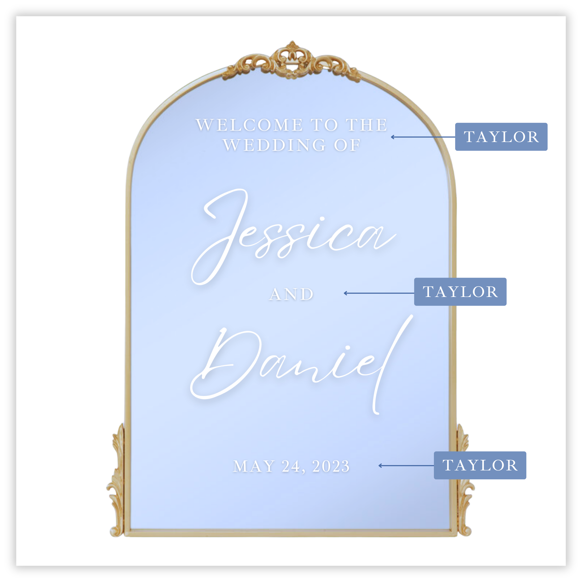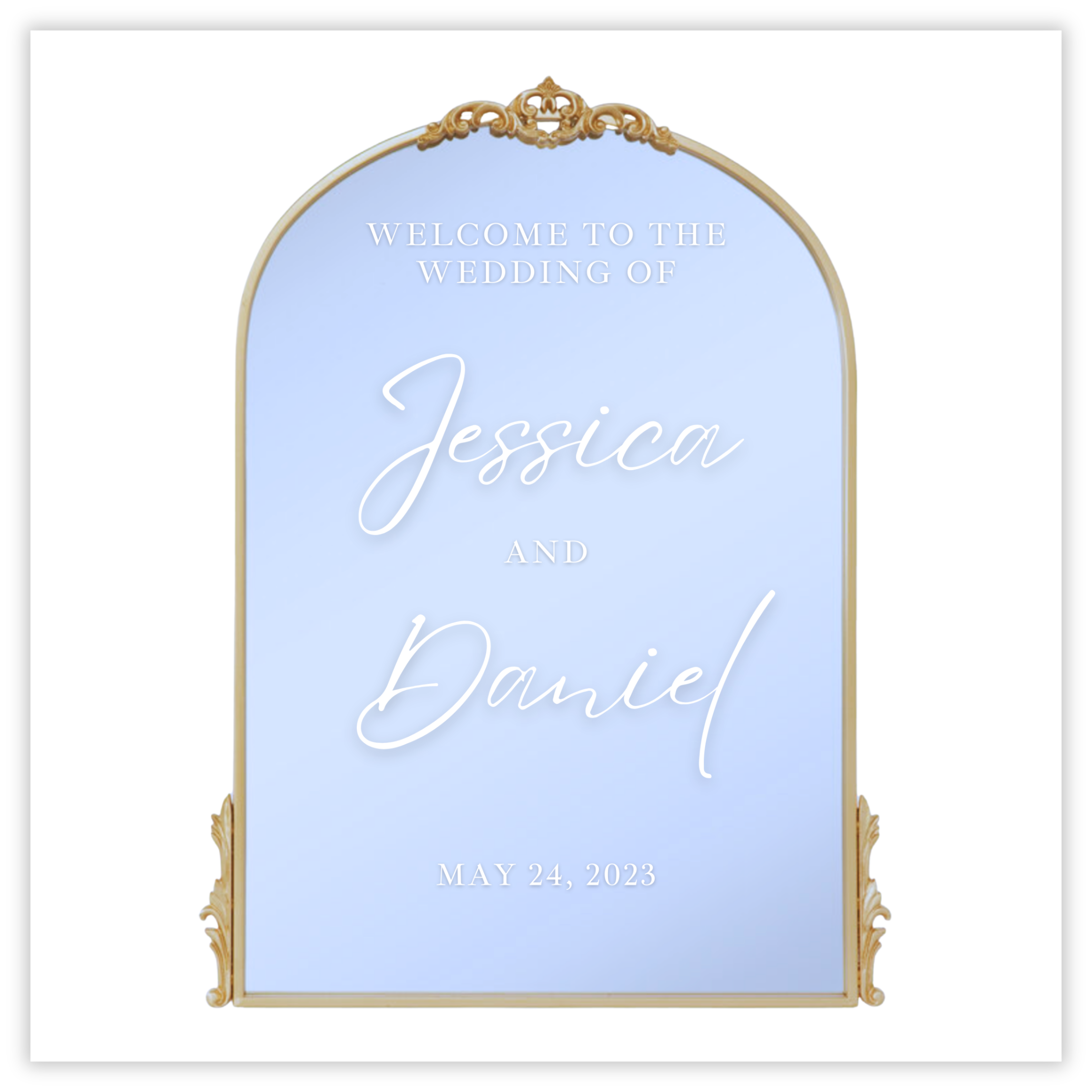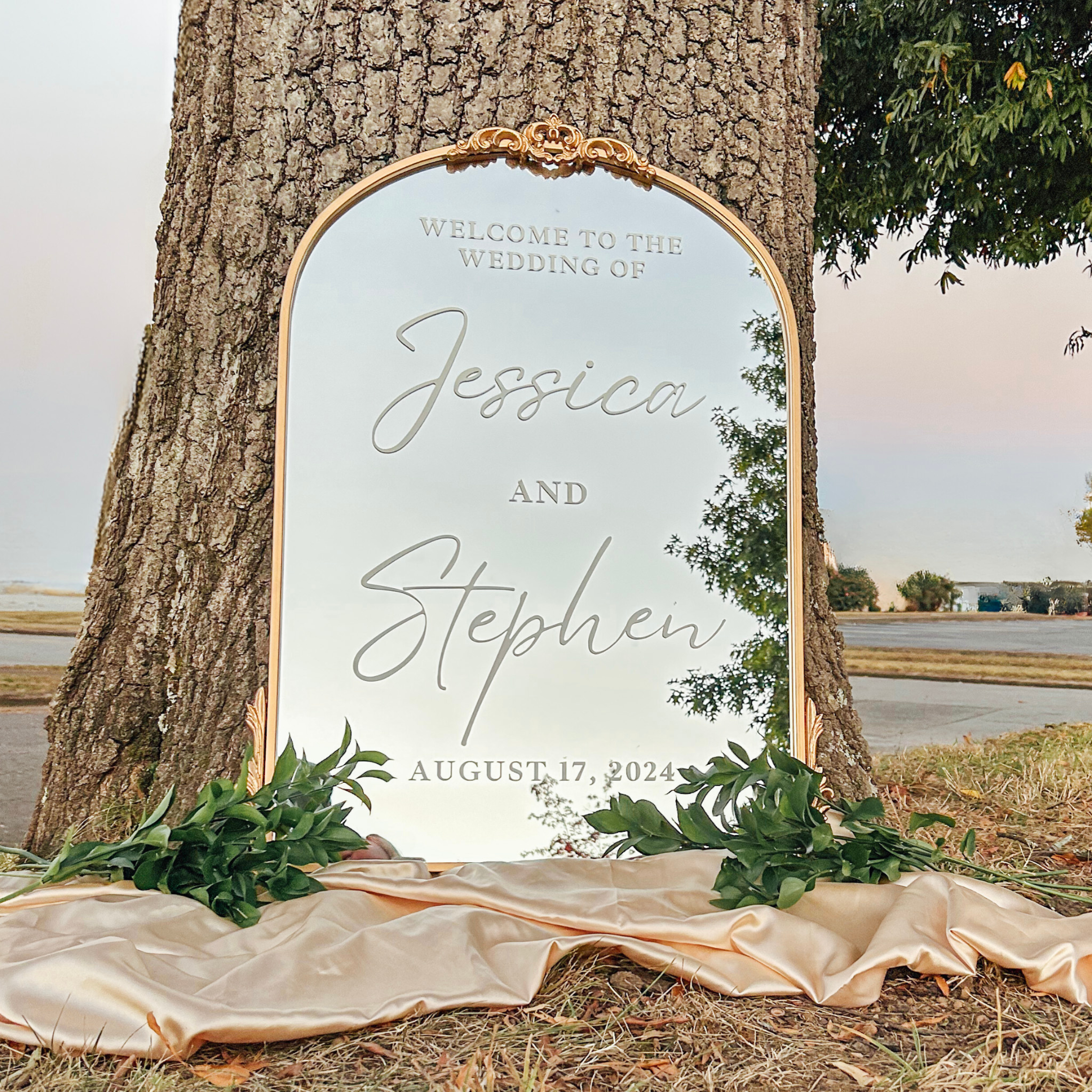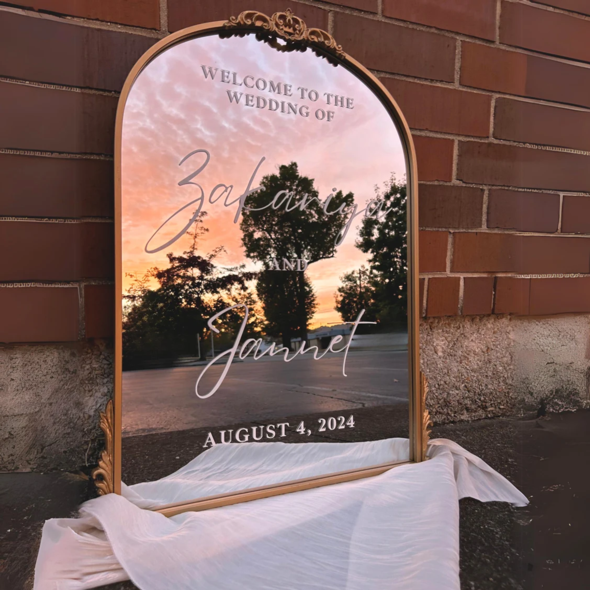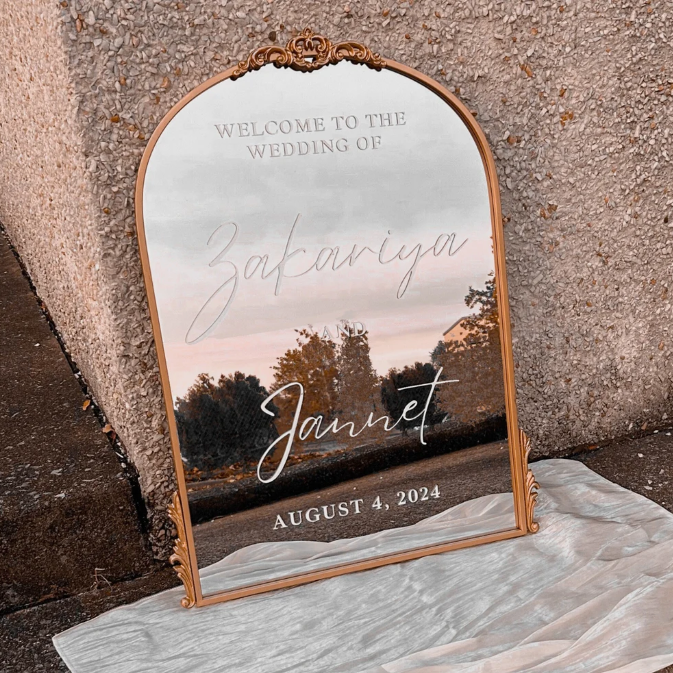 The timeless, elegant, wedding welcome sign mirror is the perfect accent to greet your wedding guests as they walk into your wedding. Magnolia Dreams customizes each mirror with the wording and font style of your choice, aiming for each bride to be stunned by their perfect welcome sign. We have an easel that we recommend as well that can hold this antiqued gold arch mirror for your big day. If you’re looking for a stunning centerpiece for your reception that will have everyone taking mirror selfies, this is the perfect touch for you! Read more details below, but feel free to message us about rush shipping, custom vinyl options, and more!