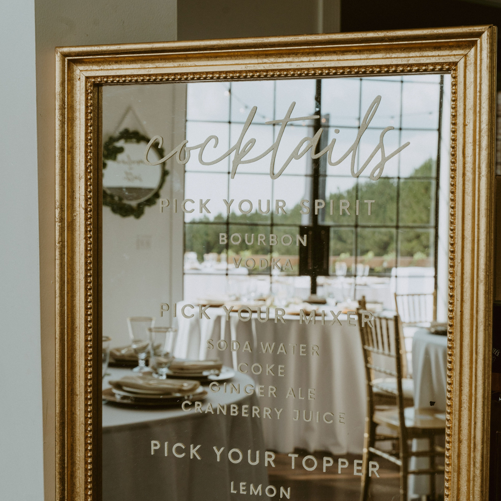 This small bar sign is perfect for your wedding reception or cocktail hour, and can easily display the beverages that you are offering guests to choose from. With it's attached stand, it can be staged anywhere and moved from place to place if needed. This wedding mirror is perfect for a small beverage offering, a signature cocktail, a pet's signature drink, or another menu that you are wanting to display. If you have questions about if your cocktail menu will fit, please message us prior so we can ensure that we have the utmost ability to create a perfect cocktail menu for you!