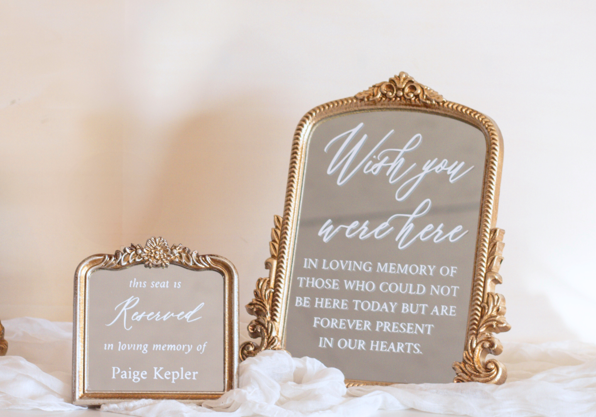 A Legacy Table, also known as a remembrance table or memorial display, is a thoughtfully curated space at your wedding that pays tribute to family members and friends who have passed. It is usually part of your welcome table display. Using Magnolia Dreams' personalized wedding remembrance signs for your wedding memorial table will create a sweet place where memories can be present during your celebration.