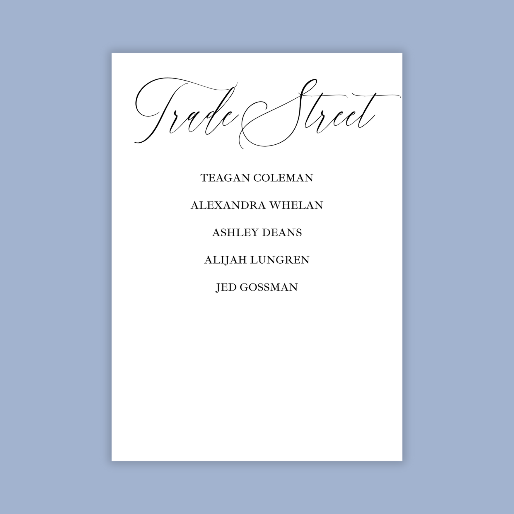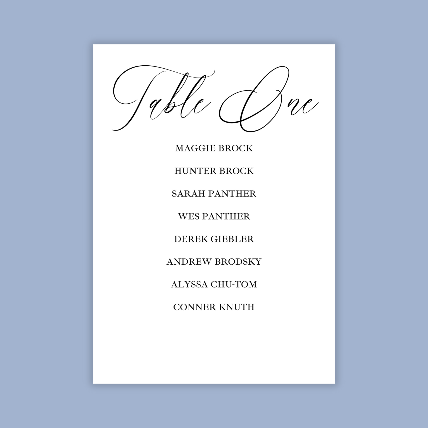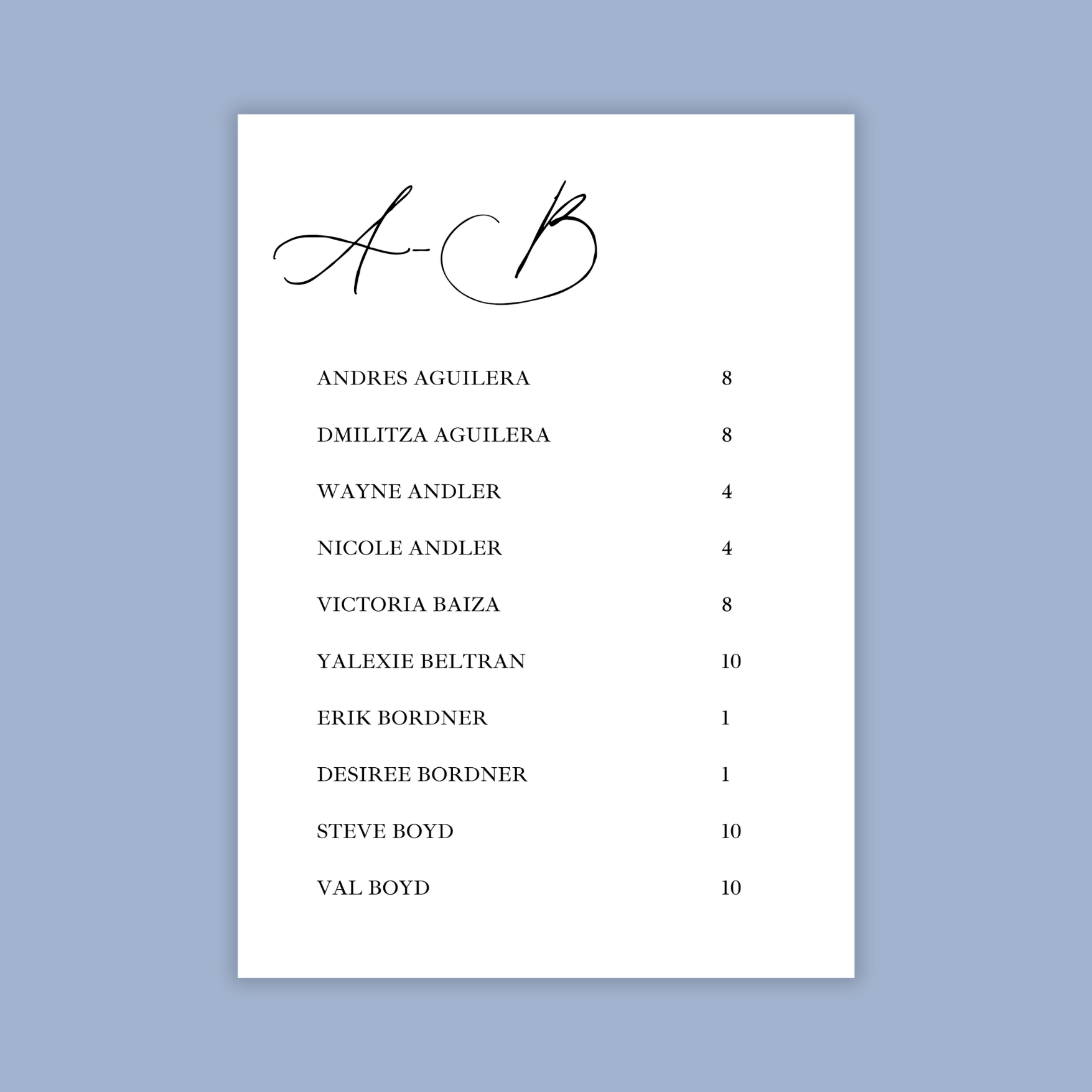 If you are wanting the names of your guests organized alphabetically instead of by table, here is the format example for you. Please reach out with any questions you may have.