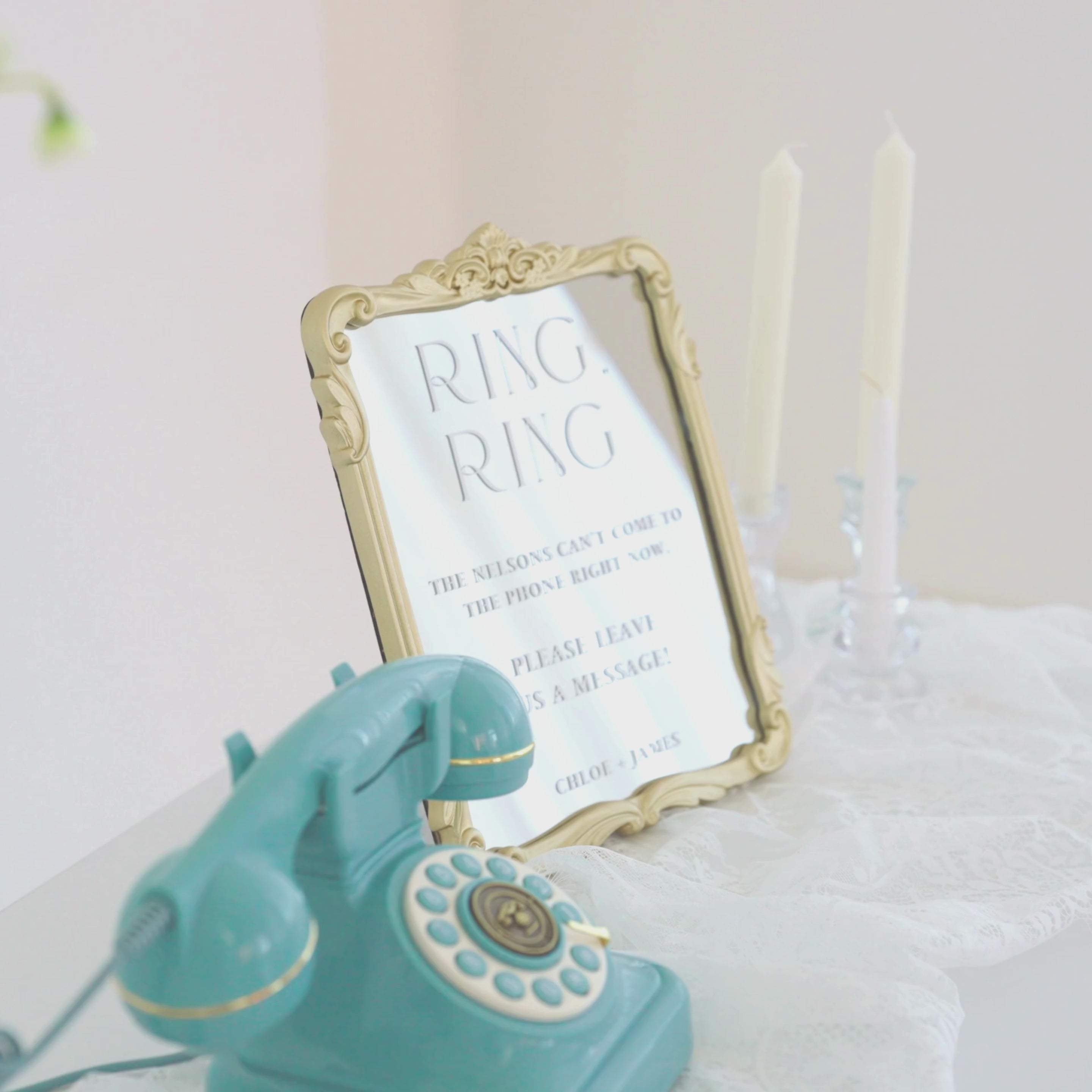 This elegant mirror features beautifully hand-lettered text, asking your guests to put away their phones and cameras during your ceremony. A stylish and reflective way to set the tone for an intimate, distraction-free experience. Have additional wording or different wording all together that you want on here? Feel free to send us a message. All of our mirrors are customizable and able to reflect the aesthetic of your wedding!