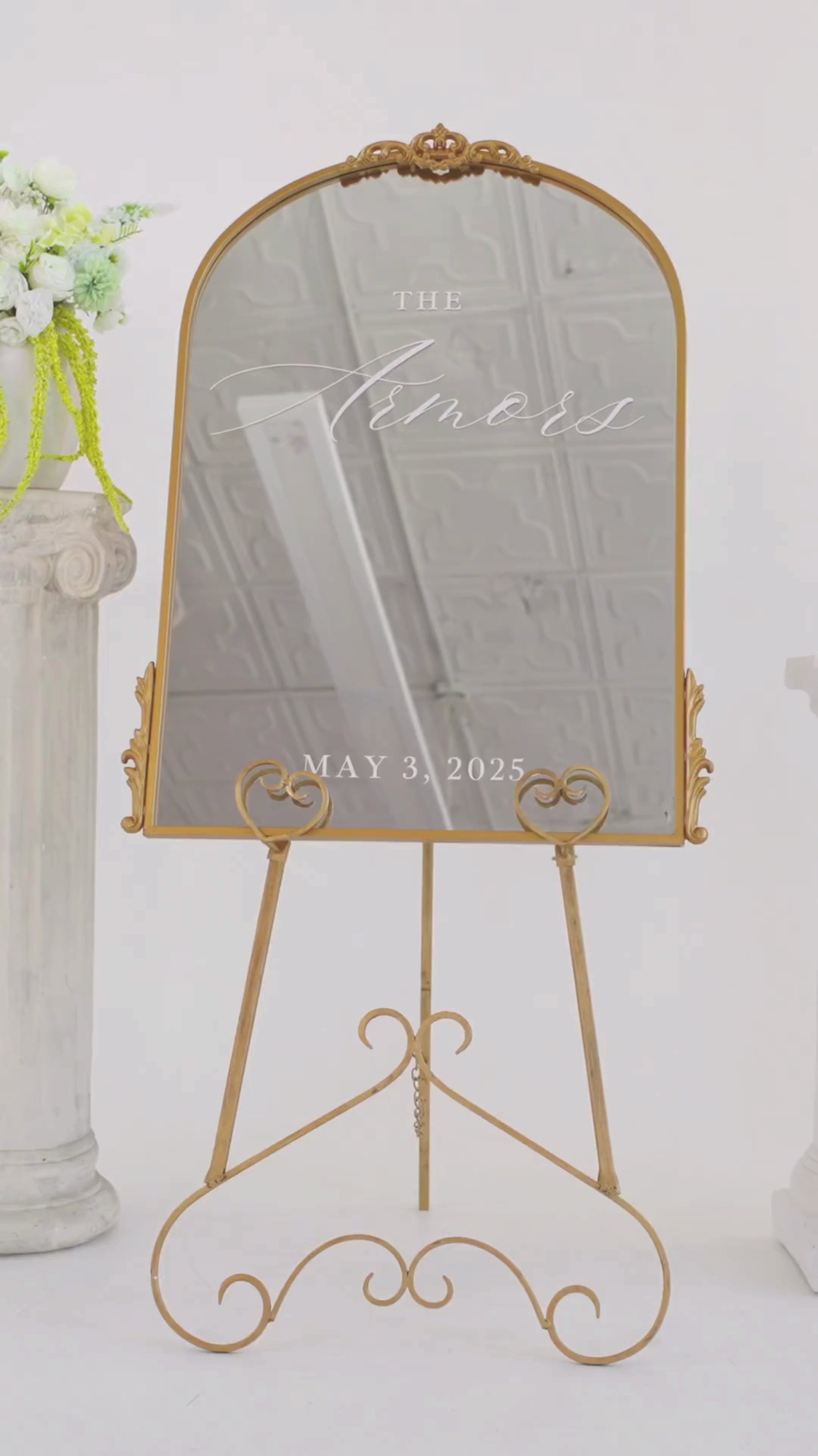 The timeless, elegant, wedding welcome sign mirror is the perfect accent to greet your wedding guests as they walk into your wedding. Magnolia Dreams customizes each mirror with the wording and font style of your choice, aiming for each bride to be stunned by their perfect welcome sign. We have an easel that we recommend as well that can hold this antiqued gold arch mirror for your big day. If you’re looking for a stunning centerpiece for your reception that will have everyone taking mirror selfies, this is the perfect touch for you! Read more details below, but feel free to message us about rush shipping, custom vinyl options, and more!